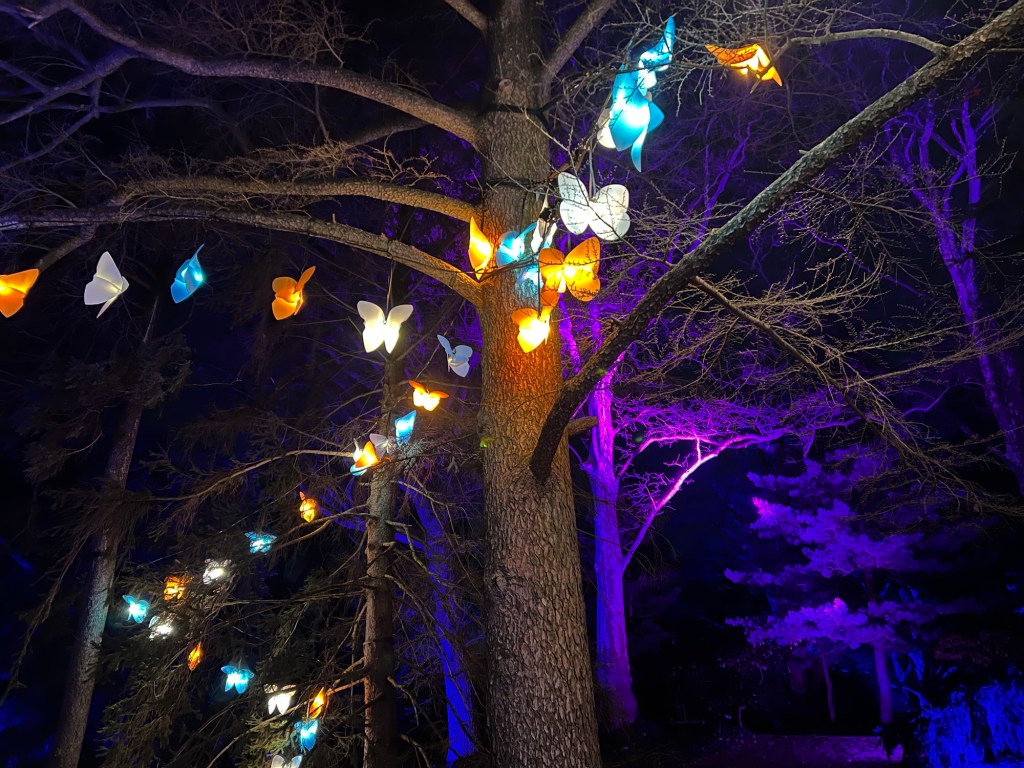 I walked down the pathway toward Daffodil Hill and could not wait until the sea of yellow flowers returned in four months. In its place was a sea of lights and sounds in the display “Papillion’s”.