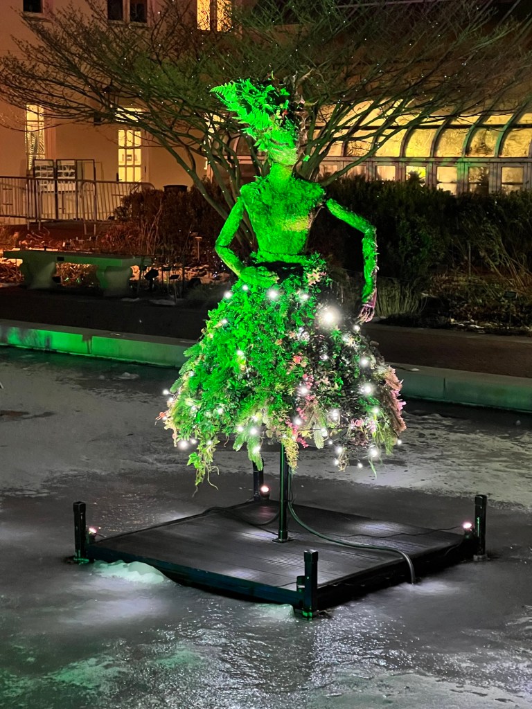 Once I left the Watershed lawns, I walked into the ‘Winter Terrace’, where in the warmer months are the Lotus Pools and seasonal plants and flowers are displayed. It was now decorated with topiary women guiding in the pools, the fountains were decorated with blinking lights and where the bar and restaurant were located. The area is really crowded with people milling around and taking a break from the walk.